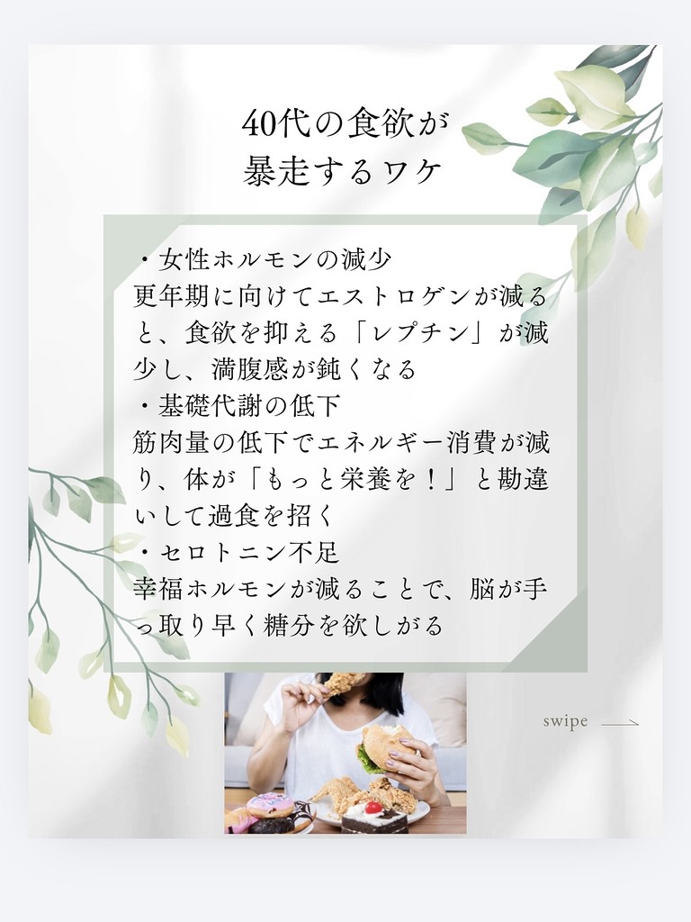 今日は、「昔より痩せにくい」と感じる40代の方へ 食べてないのに痩せない!食欲が止まらない本当の理由についてお話します。